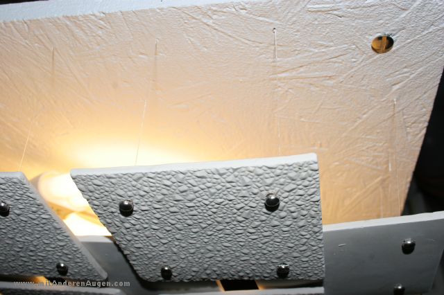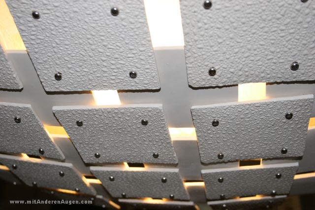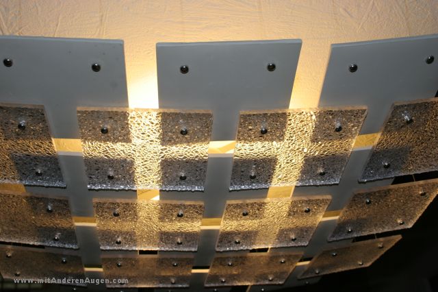Im Vergleich zur Gipsleuchte hat die Tonlampe aus glatten und geriffelten Quadraten nicht nur indirektes sondern auch direktes Licht und eignet sich daher nicht nur als Effektbeleuchtung sondern auch zur Raumbeleuchtung. Die Quadrate sind mit silbernen Klammern verbunden und hängen am Rand an dünnen, durchsichtigen Fäden. Die Montageplatte aus Holz ist bestandteil der Leuchte und wird an den vier Ecken mit der Decke verschraubt. Je nach Montage des Vorschaltgerätes auf oder unter dieser Platte kann diese mit Abstand oder bündig mit der Decke montiert werden, ganz wie es Euch gefällt. Die Bilder zeigen eine Lampe mit einem Ensemble 4x4 und einer Größe von ca. 50cm x 50cm x 20cm.