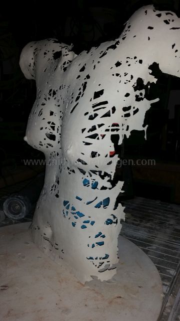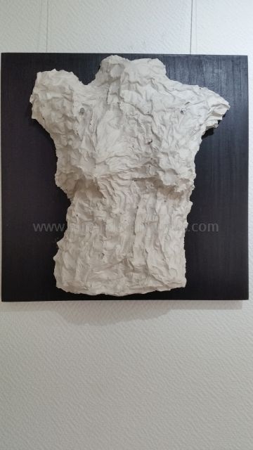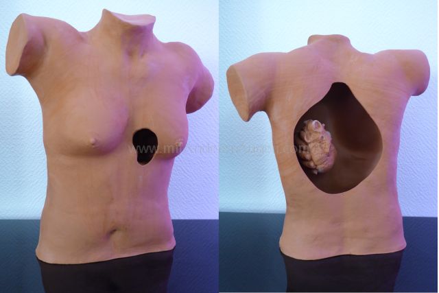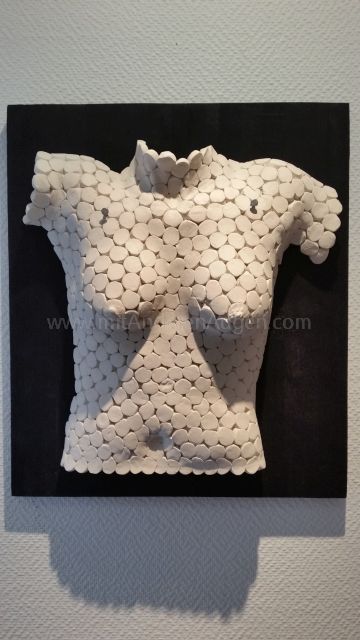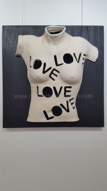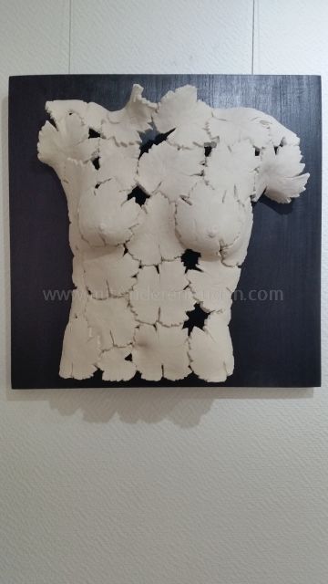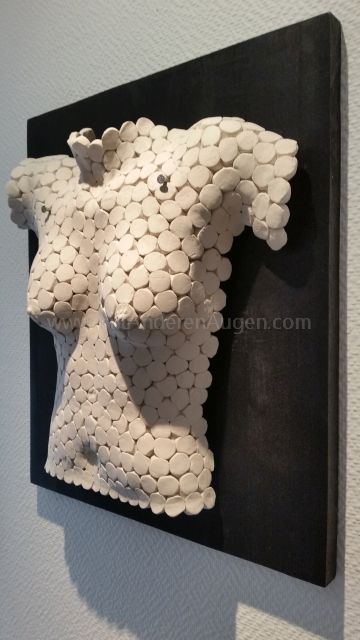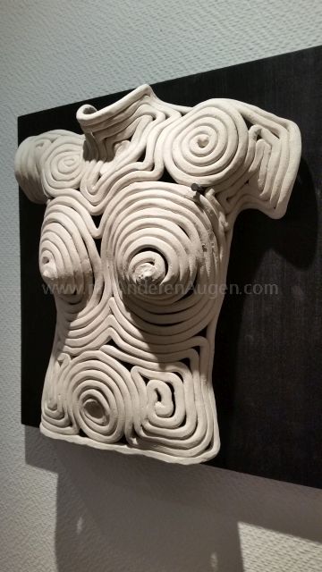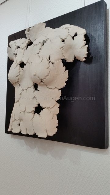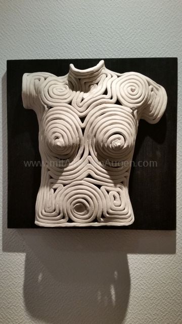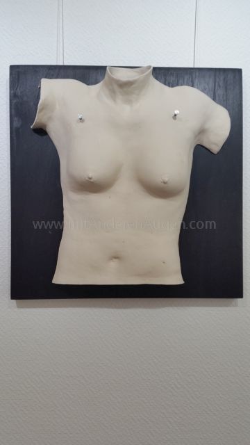 Serie mit Frauentorso als Wandbild sowie freistehende Skulpturen wie Angina Pectoris mit der das Herz umfassenden Hand.