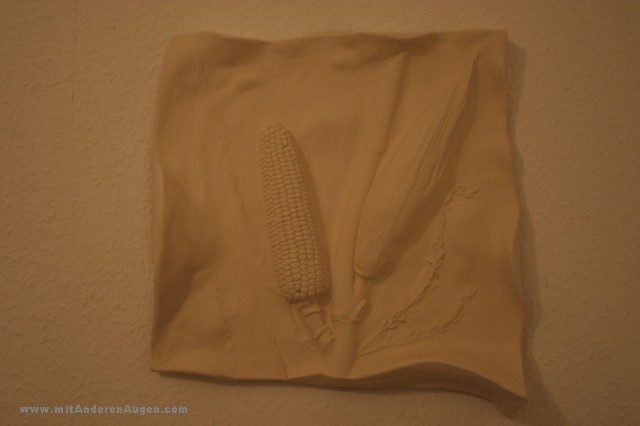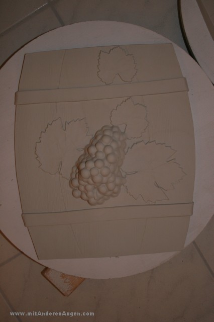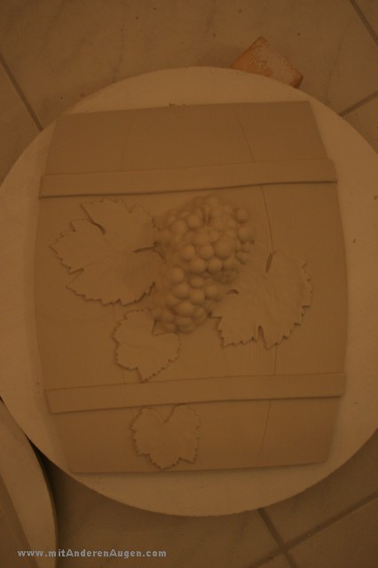 In einem aufwändigen Prozeß wurde eine Abdruck der Hand mit Trauben erstellt, mit Wachs ausgegossen, Hinterschneidungen mit Ton ausmodelliert und Stück für Stück eine zehnteilige Gipsform gegossen. Jeder Skulptur aus gegossenem Ton wird nochmal manuell überarbeitet. Es ist meine bisher komlizierteste Form, die mehrere Vorversuche (und Fehlversuche) notwendig gemacht hat. Insgesammt sind über 80 Arbeiststunden in dieses Projekt geflossen.