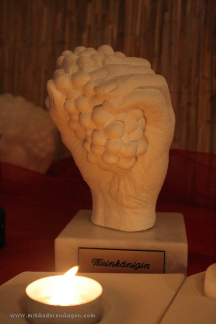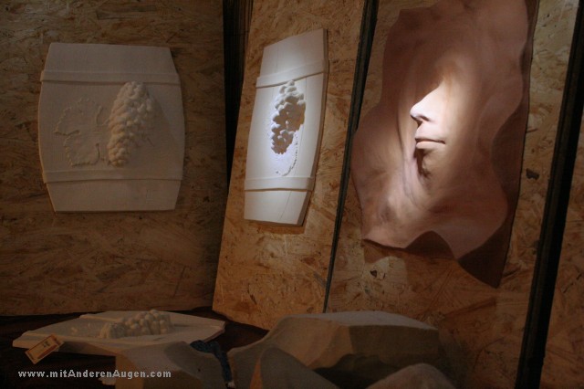 - Endlich eine neue Skulpturenserie: in vino veritas. Die vier Rebsorten (Riesling, Spärburgunder, Müller Thurgau, Silvaner) werden jeweils zusammen mit ihren Blättern detailgetreu auf einem stilisierten Fass wiedergegeben. Eine Sammlerstück für Weinkenner und -liebhaber. Anhand der unterschiedlichen Traubenformen und Blattmuster sind die Rebsorten gut zu erkennen.