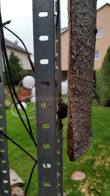 - Der Baum wird von Oben bis Unten mit einer geraden Linie markiert und dann in gleichhohe Scheiben (ca. 30cm) geschnitten. Diese werden geviertelt und die inneren Dreiecke entfernt, so dass im Inneren der vier Segmente ein quadratischer Hohlraum entsteht. Dabei ist von Anfang an auf eine gute Markierung der Segmente zu achten, damit sie wieder an der korrekten Position montiert werden können – ohne langes Puzzeln und Rätsel raten. In jedes Segment werden oben jeweils zwei Stockschrauben (mit dem Akkuschrauber) eingedreht. Ihr Abstand entspricht dem Abstand der Schlitze in den Metallrahmen. Mit einer Mutter wird der Abstand zur Metallkonstruktion eingestellt, mit einer zweiten die Stockschraube an der Konstruktion befestigt. Die Segmente haben so immer einen Abstand zur Konstruktion und können unten durch Drücken nach innen bewegt werden. Sollte dort ein Schalter sein, so drücken sie auf diesen und schließen den Kontakt. Diese Art der Befestigung gleicht Unterschiede der Baumdicke ebenso aus wie Ungenauigkeiten beim Zuschneiden.