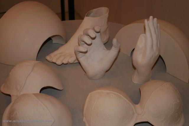 - Bei den menschlichen Abdrücken ist die endgültige Form im Allgemeinen nicht direkt herstellbar. Vielmehr wird man eine Teilform erstellen, diese mit Ton ausgießen und das so gewonnene Positiv aus Ton verändern und erweitern durch modellieren von weiterem Ton. So entsteht dann ein Objekt aus Ton in der gewünschten Form. Dieses wird nun in einem Gießkasten von Gips umschlossen. Dabei dürfen natürlich keine Hinterschneidungen bestehen, da diese sonst beim Herauslösen Teile der Figur abreißen würden, wie z.B. die Ohren. Daher wird der Gießkasten und das Objekt mit zusätzlichen Trennwänden aus Ton so eingeteilt, dass man nach und nach jeweils einen Teil einer Gipsform gießen kann, der für sich keine Hinterschneidungen hat. Jede Teilform muss trocknen, bevor der nächste Teil der Form hergestellt werden kann. So entstehen Formen aus drei, vier, fünf oder noch mehr Teilen.